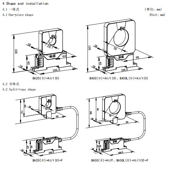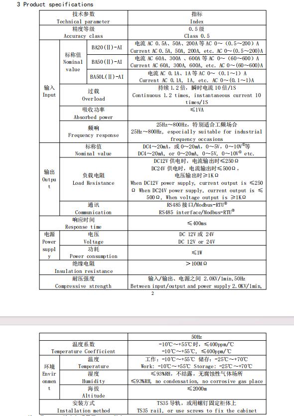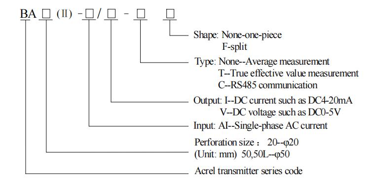The intelligent BA series current sensor utilizes the principle of electromagnetic induction to measure AC current in the power grid in real time. Employing constant current and linear compensation technology, it isolates and converts the current into a standard DC signal output, or transmits the measurement data via an RS485 interface (Modbus-RTU protocol). Powered by a safe DC 24V or 12V voltage, it can be widely used in industrial automation. The BA50L(Ⅱ)-AI is an AC residual current transformer, primarily used to detect leakage current in electrical systems. It allows for real-time monitoring of electrical circuits and equipment, preventing accidents such as fires caused by leakage.